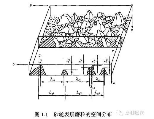 图1-1给出了砂轮表层磨粒的空间分布。图中,xy坐标平面即为砂轮外层工作平面,沿平行于yz坐标平面所截取的磨粒轮廓图即为砂轮工作表层的磨粒形貌图。从该图中可以看出砂轮磨刃间距λS及磨刃尖端距砂轮表面的距离ZS均不一定相等,因此在磨削过程中,有的切削刃是有效的,而有的切削刃是无效的;即使是有效切削刃,其切削截面积的大小也不相同。