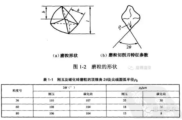 磨粒的形状是很不规则的,如图1-2所示,磨粒切削刃特征可用顶锥角2θ及尖端圆弧半径ρg表示,它们与磨粒尺寸b的大小有关。实际上,每颗磨粒有多个顶尖,因而有多个顶锥角,按统计规律顶锥角在80°~145°之间变动。刚玉及碳化硅磨粒的顶锥角2θ及尖端圆弧半径ρg如表1-1所示。磨粒磨刃前角的大小与顶锥角有关。